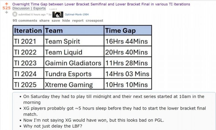 TI14最短,为10小时10分,而且根据XG领队蒜头提到,打完BB以后,XG的选手都还处于亢奋状态,然后还要坐车回酒店(车程1个小时左右),隔天早上还要提早到场馆,加上其他梳洗吃饭等时间,几名选手的实际睡眠时间是1-4个小时左右,比赛期间也需要大量咖啡进行提神,Ame一天喝了四杯冰美式,Xxs每场打完和上台前,复盘的时候,都是直接瘫坐在地上,Optimal-Monk-1984表示并不是说XG休息充足就一定会赢,但这确实让赛事方PGL的赛事能力看起来很糟糕。