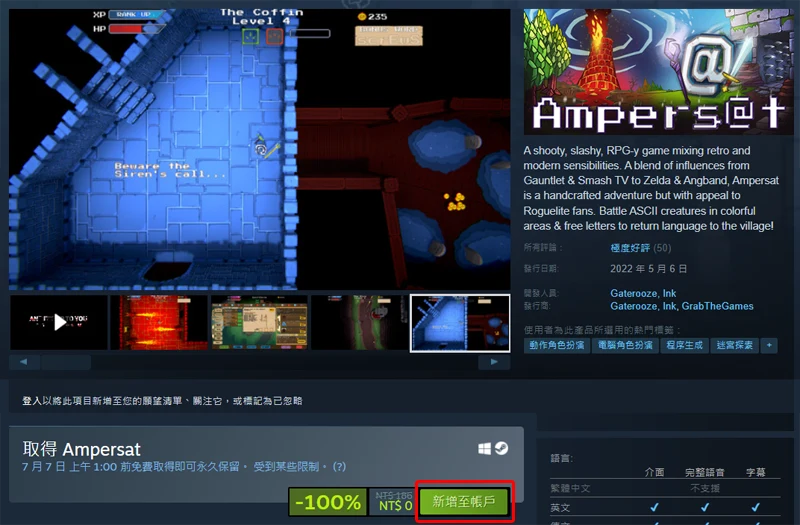 喜歡 Roguelite 類型與復古風格的玩家注意啦!由 Gaterooze, Ink 打造的獨立 RPG《Ampersat》目前正在 Steam 平台限時免費開放中,只要在活動期間內登入帳號將遊戲加入收藏,即可永久保留。