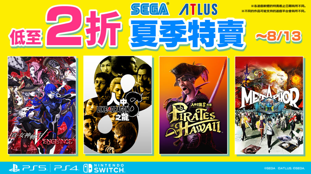 SEGA 夏季特賣活動正式開跑! 現在在 PlayStation™Store 以及 Nintendo eShop 上,多款人氣遊戲正進行限時折扣,不論你是《人中之龍》粉、《索尼克》玩家還是 ATLUS JRPG 愛好者,這波活動都不容錯過!